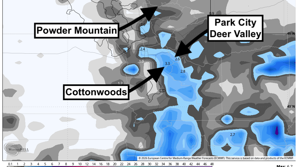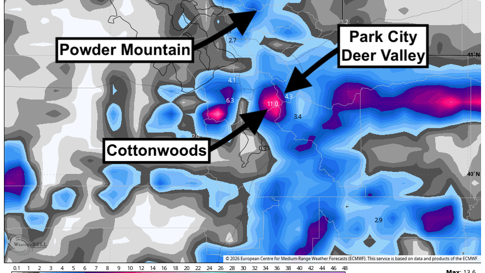 The intensity spread is wider once you move away from the Cottonwoods. Some solutions still paint useful snow into Eagle Point and the northern fringe, while others keep those areas modest, and the Park City side remains more marginal with warmer air early in the event. Much of that non-Cottonwood terrain in this data set is already closed, so from a practical skiing standpoint, the focus stays on Alta, Snowbird, Brighton, and Solitude.